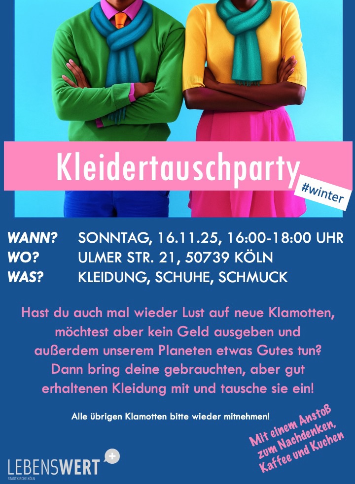 Am 16.11.2025 steht schon die nächste Kleidertauschparty an! Also bringt eure gut erhaltene Kleidung, Schuhe, etc. mit und tauscht sie ein!